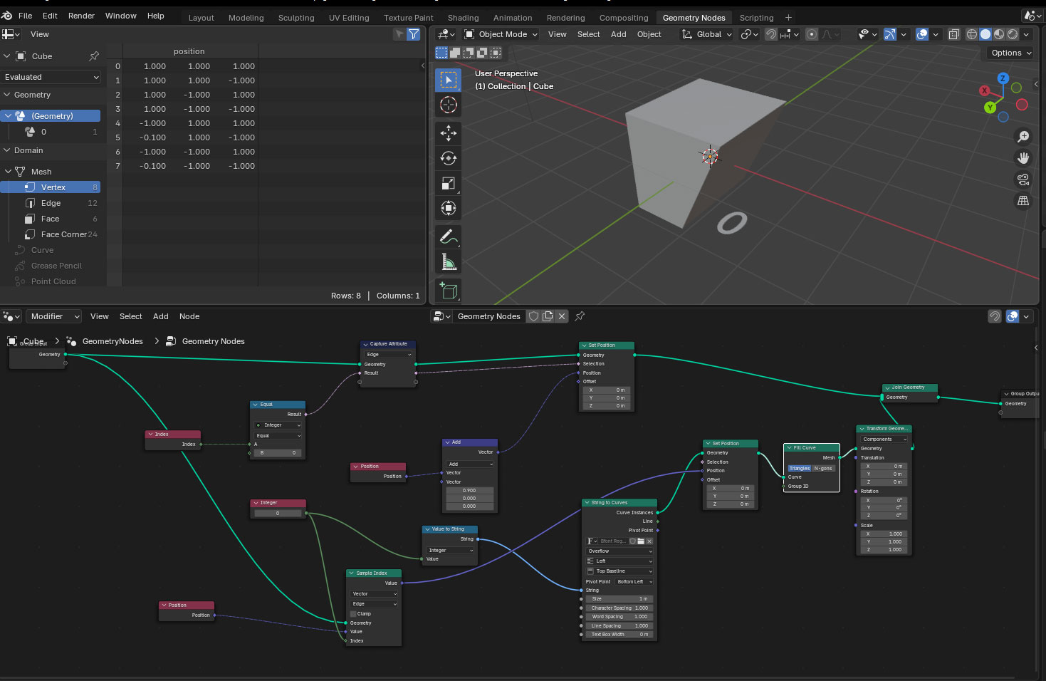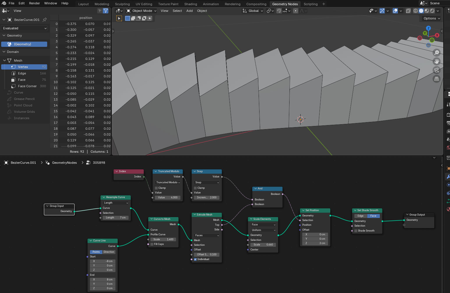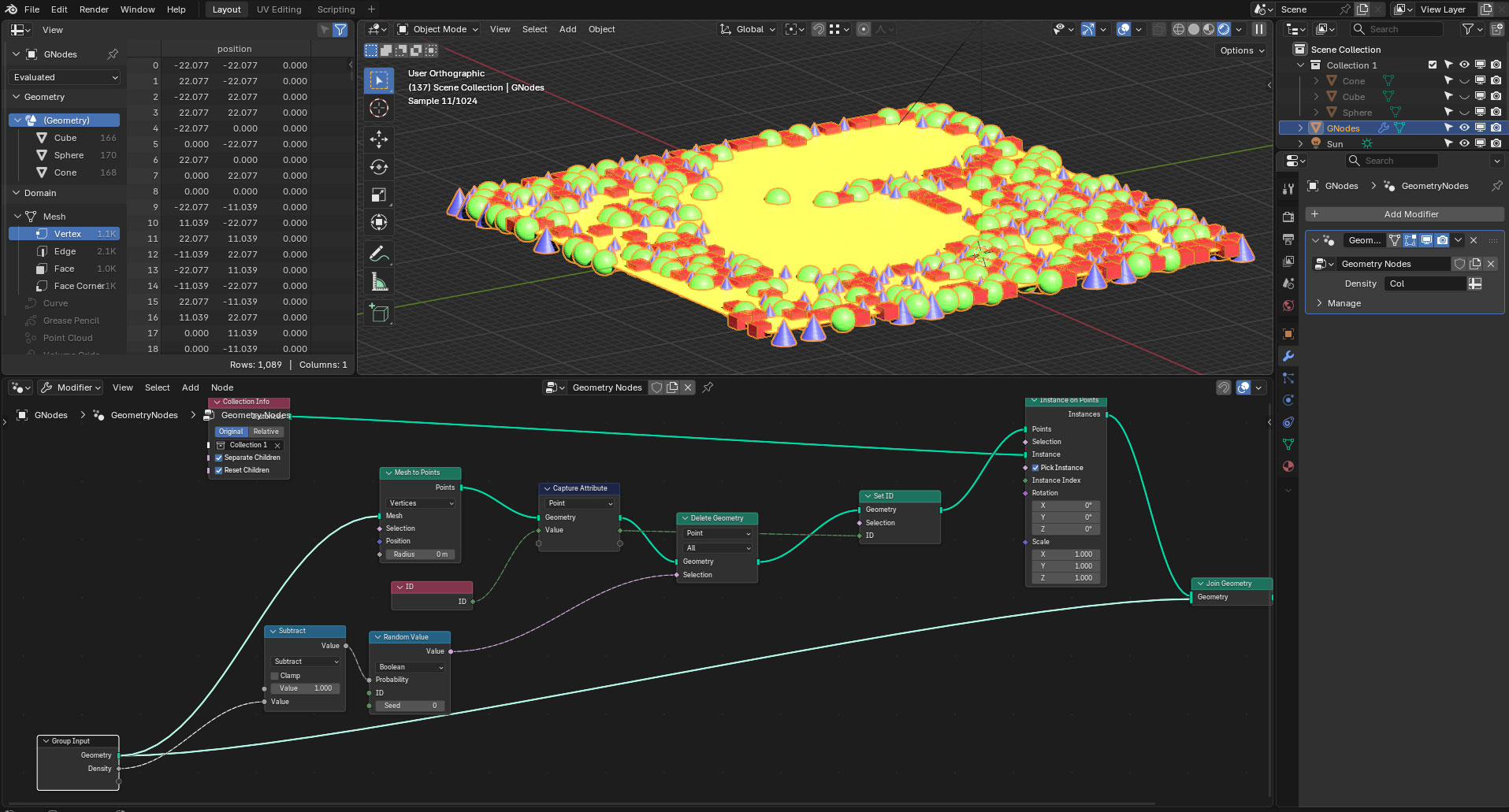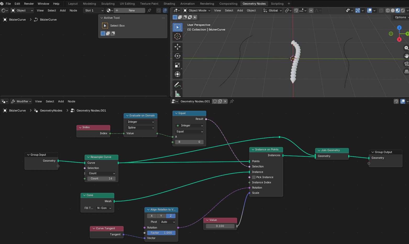 Le geometry node est un outil paramétrique de Blender. Il est alors possible de connecter entre eux différents nodes pour construire de la géométrie en ayant la possibilité de revenir en arrière, d'ajouter, de retrancher différents éléments d'une géométrie.