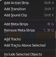 Ce menu va nous permettre d'ajouter et d'enlever tous les types de strips. Pour rappel, y a trois types de strips : Action, transition, Meta: Les actions contiennent des données réelles d'images clefs. Les transitions effectuent des calculs entre les actions. Les Meta regroupent les actions strips et les transitions.