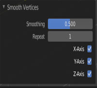 Le smooth géométrique comme son nom l'indique va modifier la géométrie du mesh concerné. Cette commande se trouve dans le menu Vertices (CTRL V) et dans le Mesh Tools du panneau T de la 3D View. Il est possible d'intervenir sur les paramètres qui s'affichent dans le menu contextuel du Panneau T de la 3DView